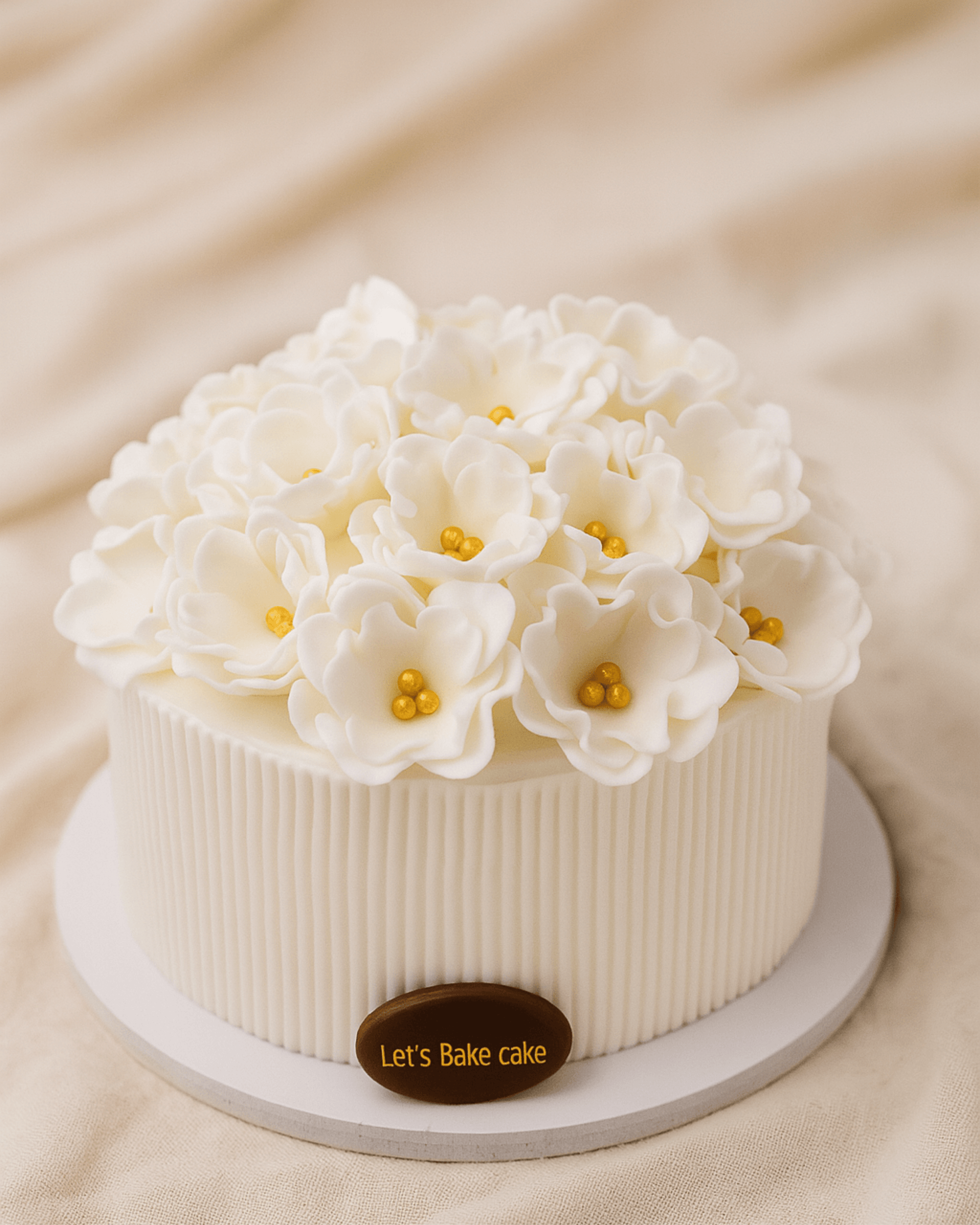 A timeless beauty crafted for special occasions. This elegant white cake features delicate handcrafted cream flowers with golden pearl centers, sitting atop a smooth, vertically textured finish. Perfect for anniversaries, bridal showers, weddings, or anyone who loves a touch of class.