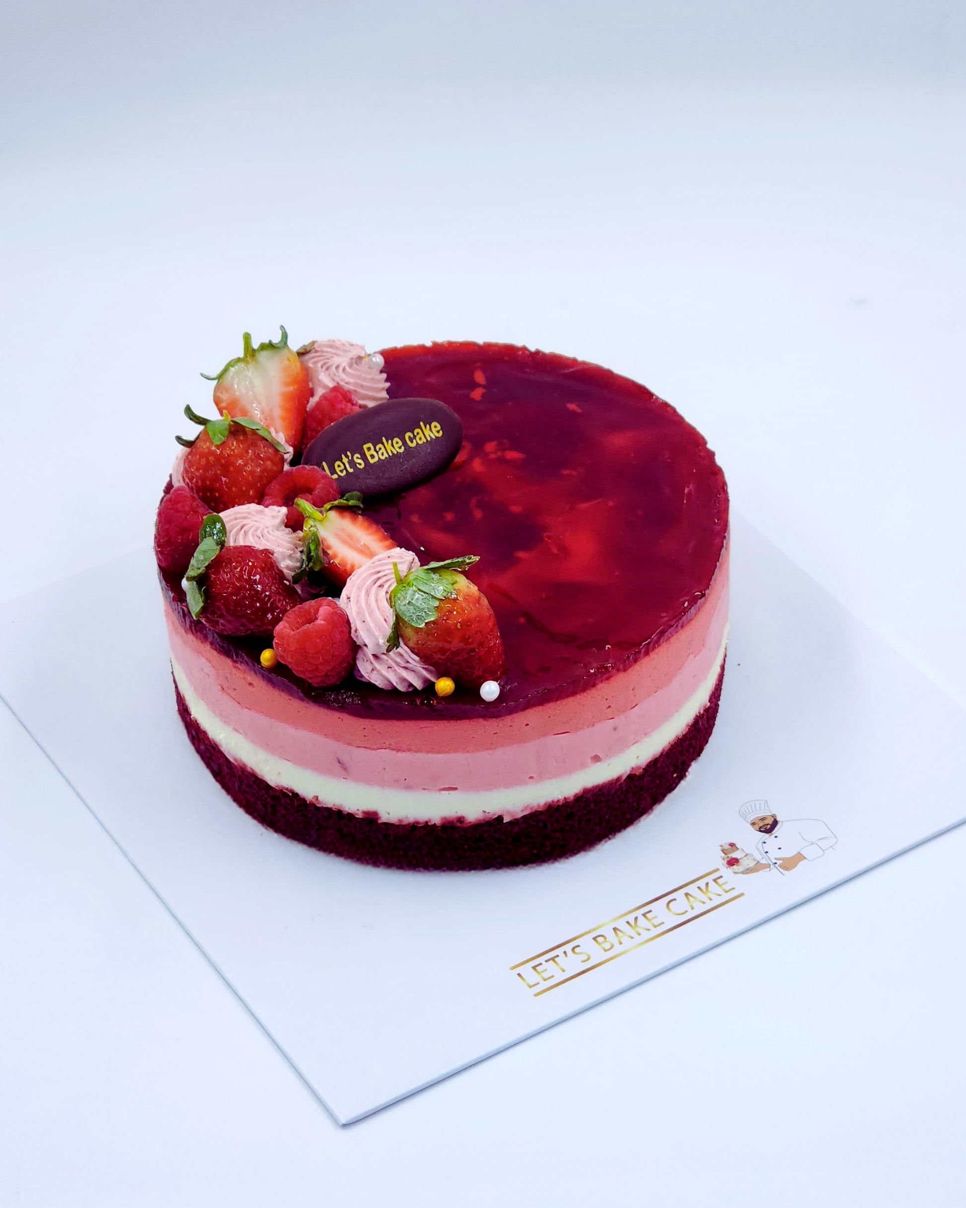 Indulge in the perfect balance of sweet and creamy with our Strawberry Mousse Cake. This elegant dessert features layers of light strawberry mousse, velvety vanilla cream, and a soft red velvet sponge — topped with a rich strawberry glaze, fresh strawberries, raspberries, and whipped swirls. A fruity favorite for any celebration!