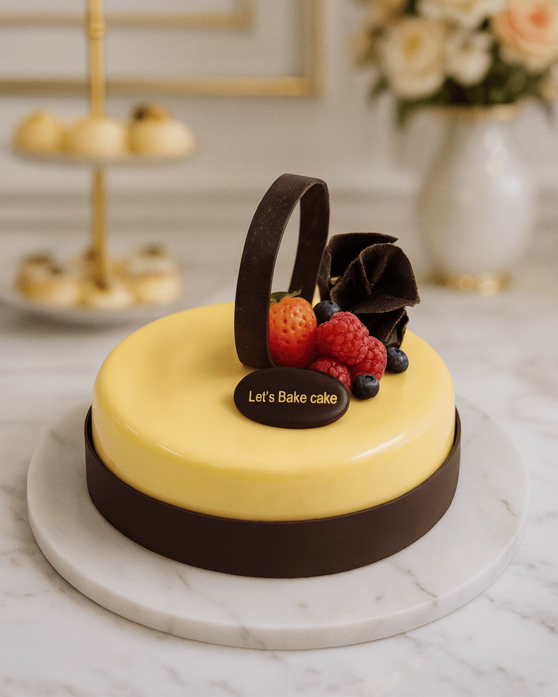 A modern dessert masterpiece that’s as luxurious as it is delicious. This yellow-glazed mousse-style cake is topped with fresh berries, chocolate art, and a signature “Let’s Bake Cake” emblem. Its glossy finish and elegant décor make it perfect for refined celebrations or as a stunning gift.